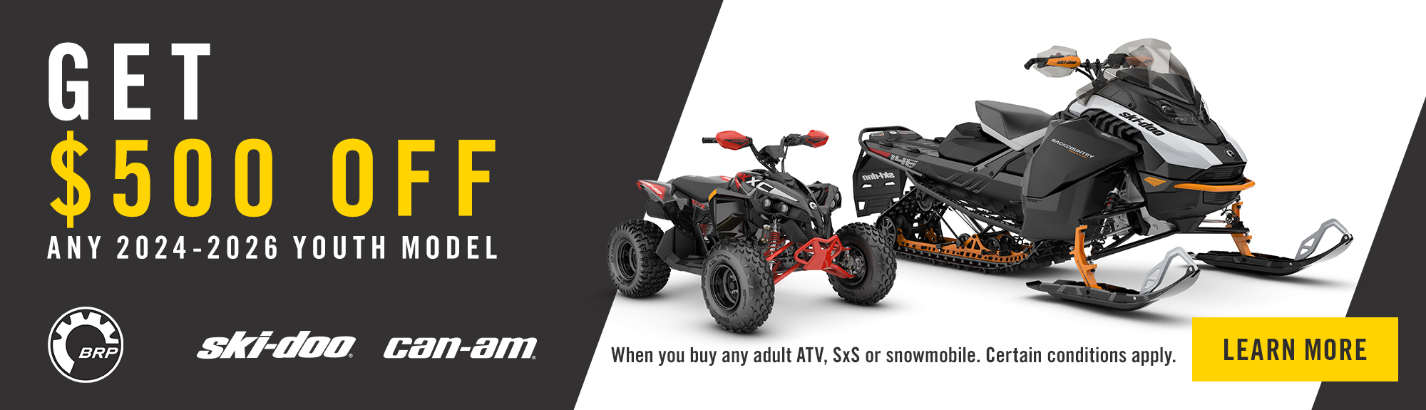 "©2025 Bombardier Recreational Products Inc. (BRP). All rights reserved. ®, ™ and the BRP logo are trademarks of BRP or its affiliates. In the U.S.A., products are distributed by BRP US Inc. Offers valid in U.S.A. only from November 1, 2025 to January 31, 2026. The conditions may vary depending on your location and this offer is subject to termination or change at any time without notice. This offer is not refundable, exchangeable or transferable (including from one dealership to another), cannot be redeemed for cash, credit or other products of equivalent value and cannot be combined with any other offer or rebate. Null where prohibited by law. Until supplies last. Returns of any portion of the purchase will require equal forfeiture of offer or amount equal to the offer. Eligible models are new and unused 2024-2026 Can-Am ATV or Ski-Doo Youth models.