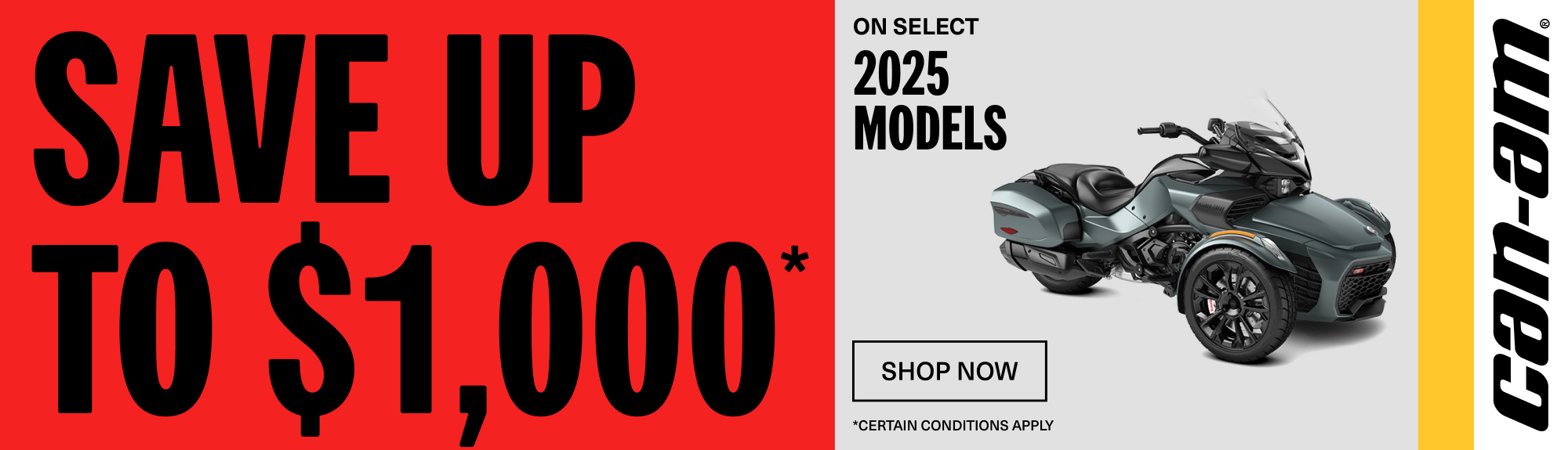 ©2025 Bombardier Recreational Products Inc. (BRP). All rights reserved. ®, ™ and the BRP logo are trademarks of BRP or its affiliates. In the U.S.A., products are distributed by BRP US Inc. Offers valid in U.S.A. only between November 1, 2025 - January 31, 2026. The conditions may vary depending on your location and this offer is subject to termination or change at any time without notice. This offer is not refundable, exchangeable or transferable (including from one dealership to another), cannot be redeemed for cash, credit or other products of equivalent value. Null where prohibited by law. Until supplies last. Eligible units are all new and unused 2025 Can-Am 3-Wheels models. Other Can-Am On-Road models may qualify for other promotions, see local dealers for details.